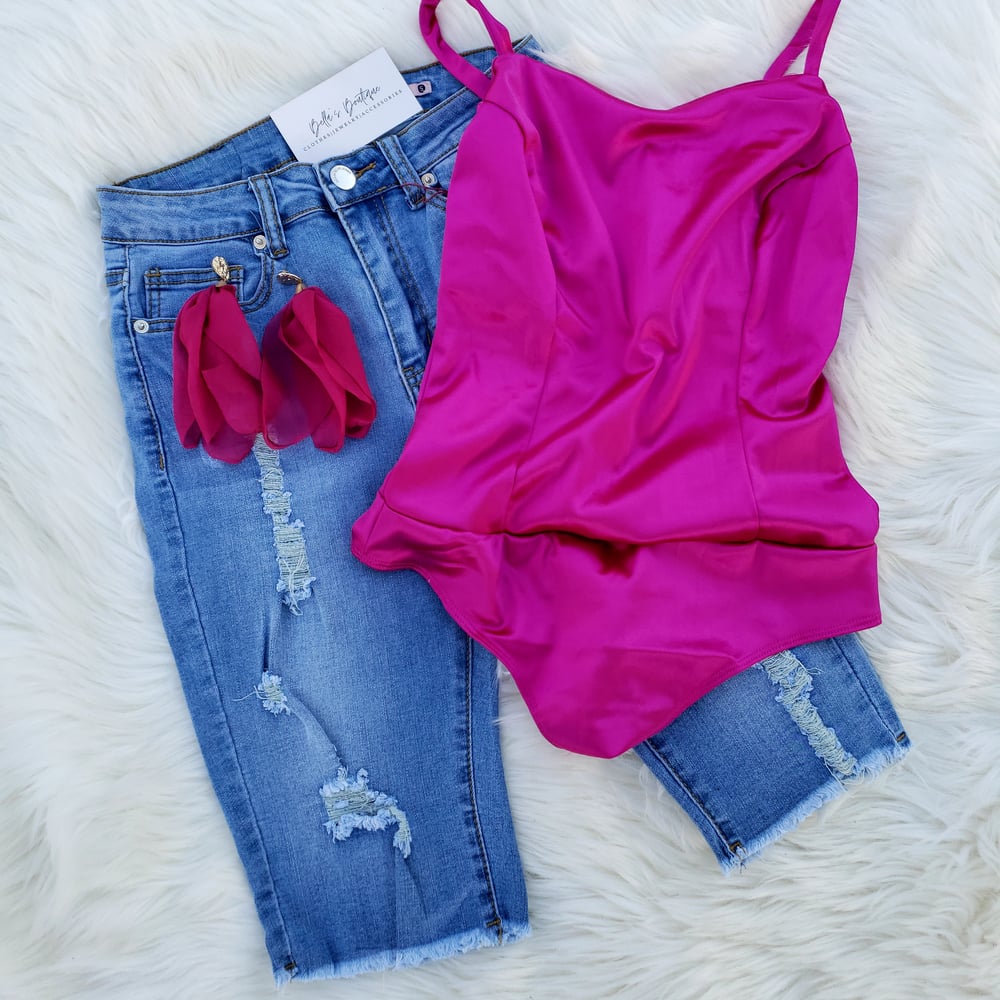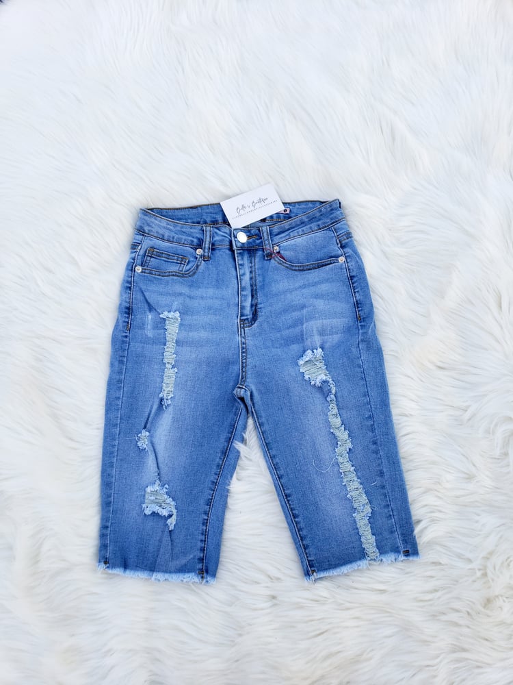 *front and back distressed design *five pocket *front zipper *denim Bermuda shorts *Material: 70% cotton, 25% Polyester, 1% Rayon, 2% spandex