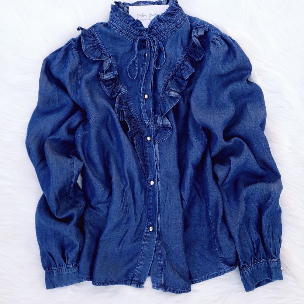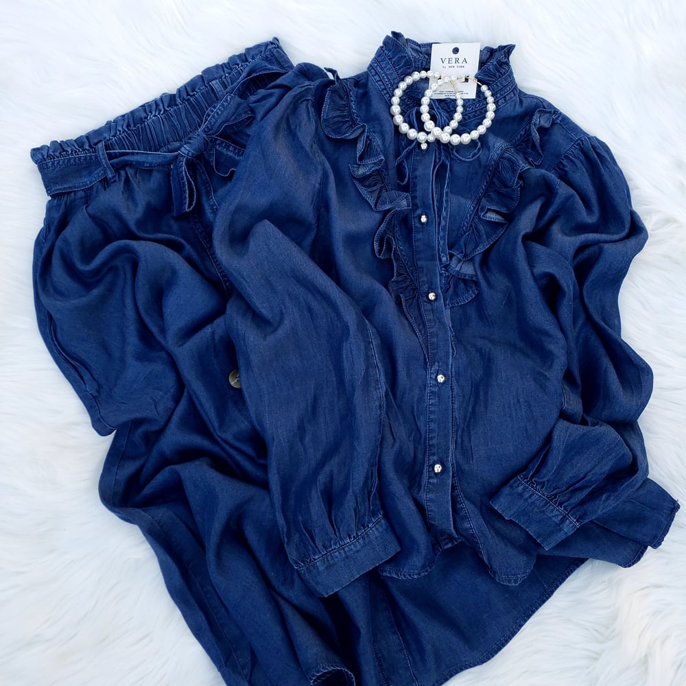 *Button front closure *Long sleeves *Ruffle mock neck *Collar string tied *Material: 100% Lyocell **Final Sale**