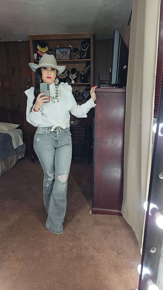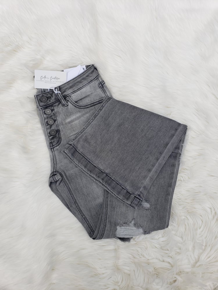 - mid rise button up distress flare - exposed button fly - distress -9 rise, 34 inseam in size3 - 95% Cotton, 4% polyester, 1% spandex