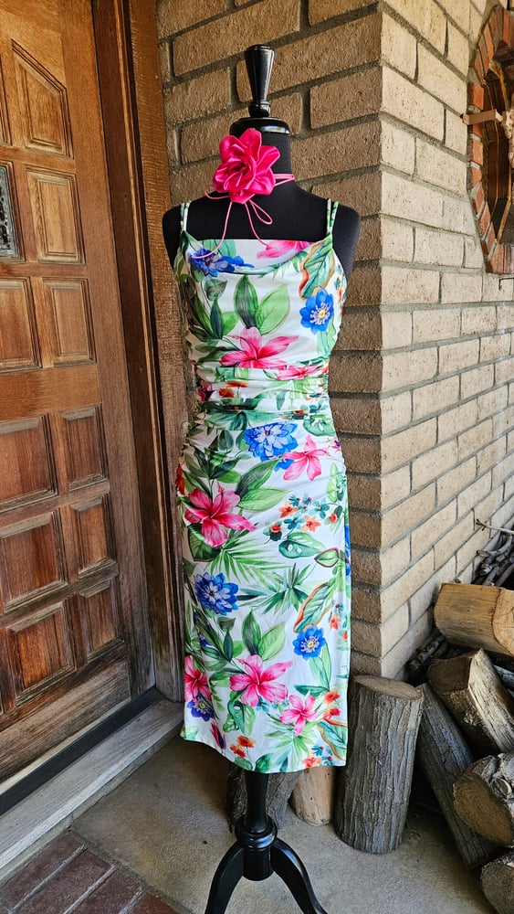 -cowl neckline -adjustable double-cami straps -ruched design -midi length -Material: 85% polyester, 15% spandex
