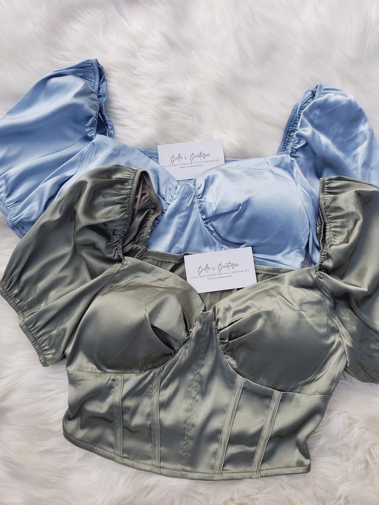 *sweetheart neckline *princess seams *short puff sleeves *concealed side zipper *cropped hem *Material: 98% polyester, 2% spandex