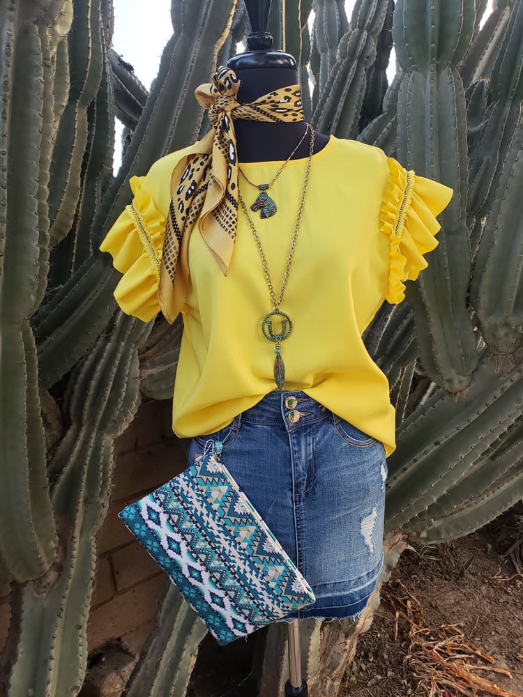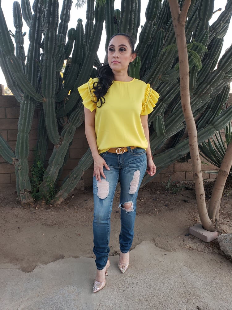 * Rhinestones on the sleeves *Ruffle Detailing *Full Length Blouse *Not see through *Roomy fit *Material: 100% Polyester