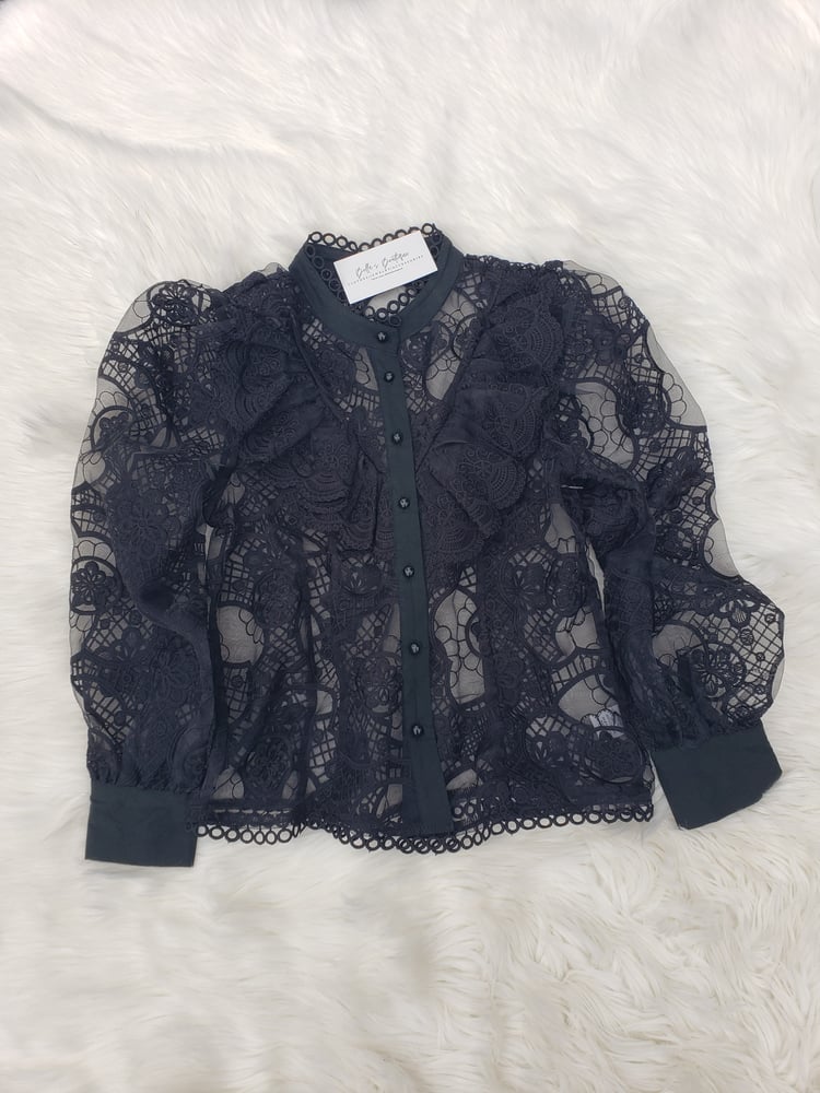 - sheer woven top - ruffle trim - floral lace design - button down front - waist-length - 100% polyester