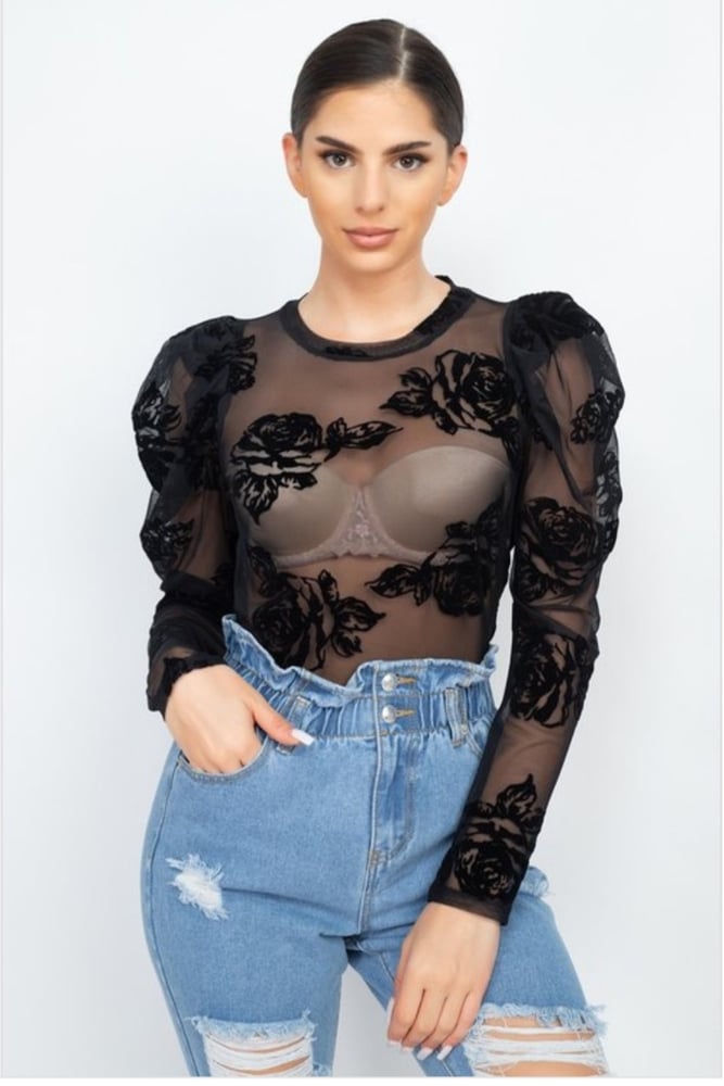 *Sheer lace design *No lining under *flower-embroidered detail *long puff sleeves *Material: 90% Polyester, 10% Spandex