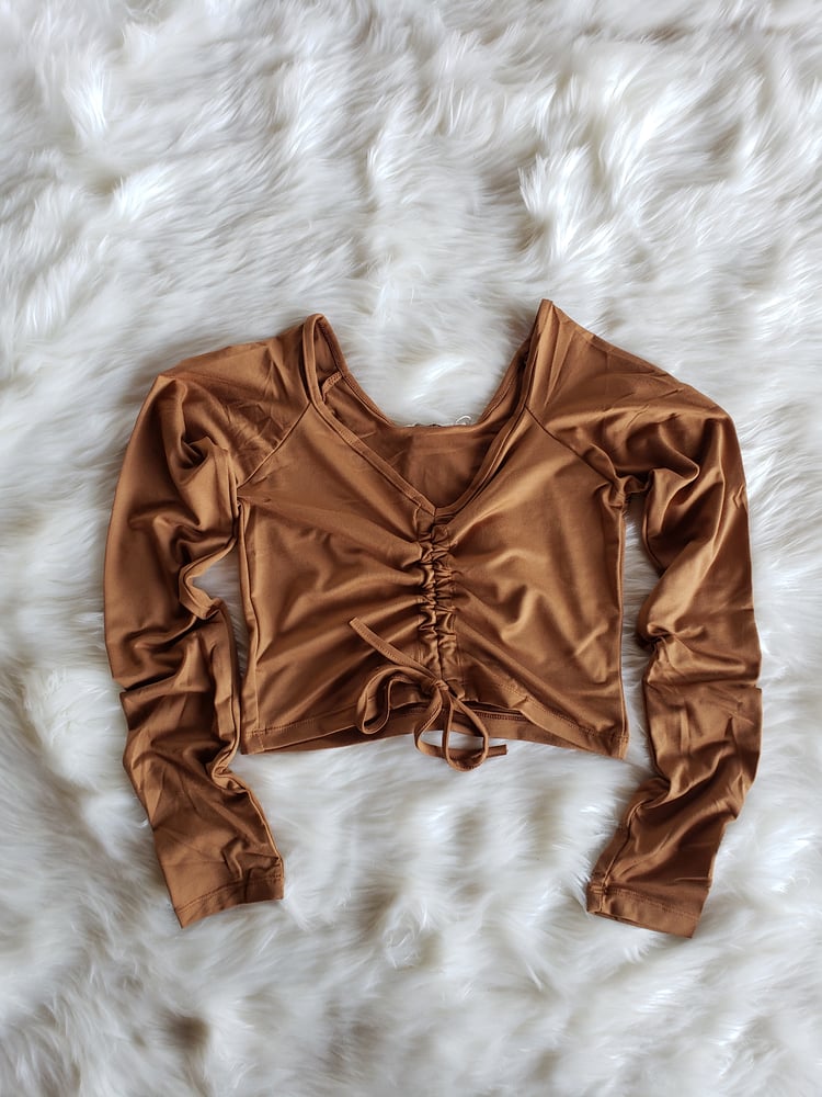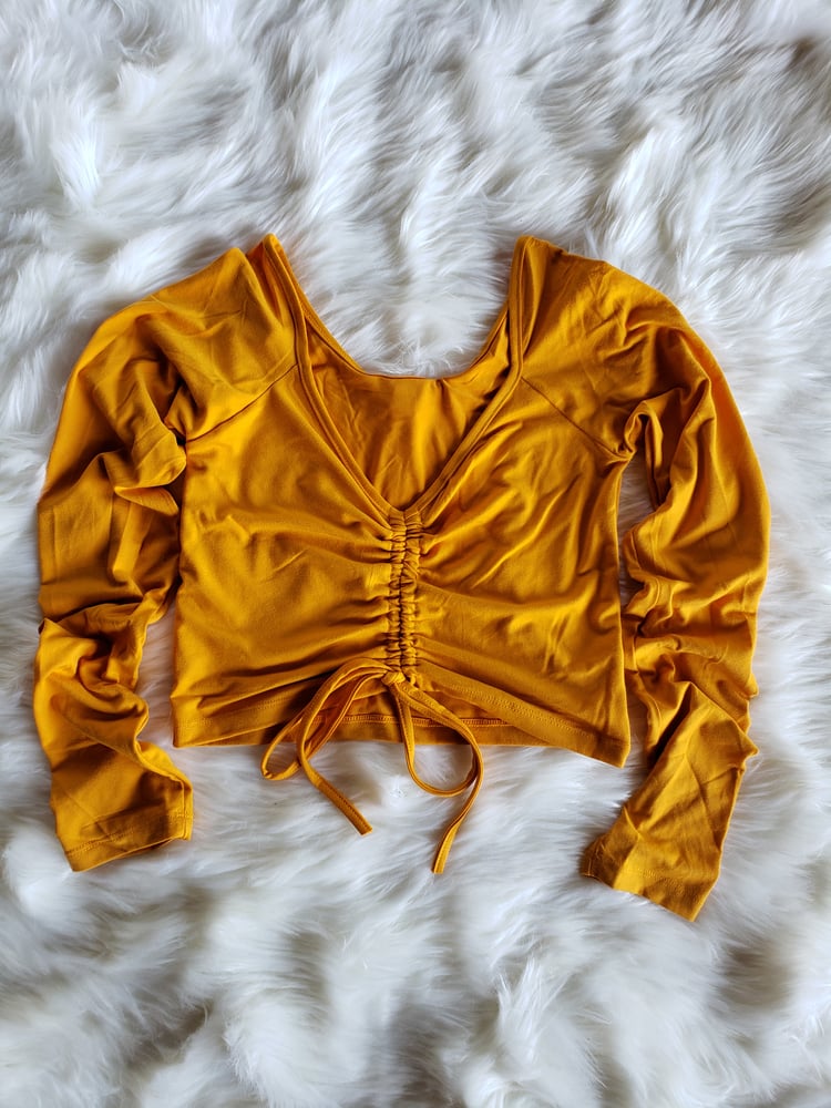 * Strap ruched front crop top * Stretch knit * Long sleeve * Square neckline *Material: 92% Polyester 8% Spandex *final sale
