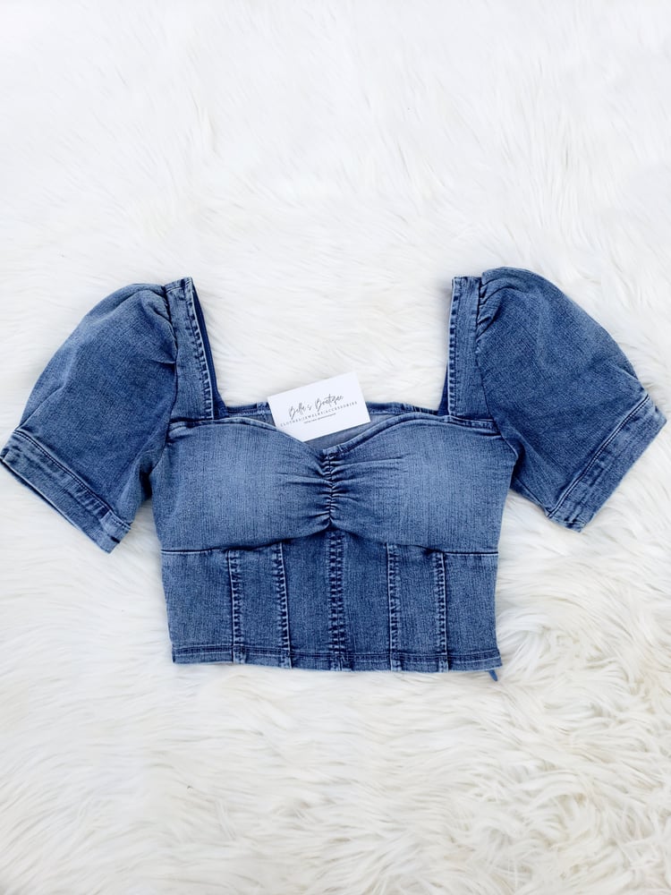 -crop top denim -side zipper -material: 45% cotton, 30% rayon, 23% polyester, 2% spandex -puff sleeves