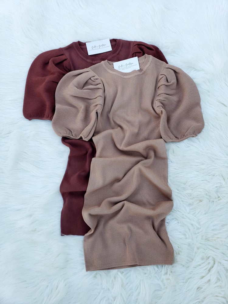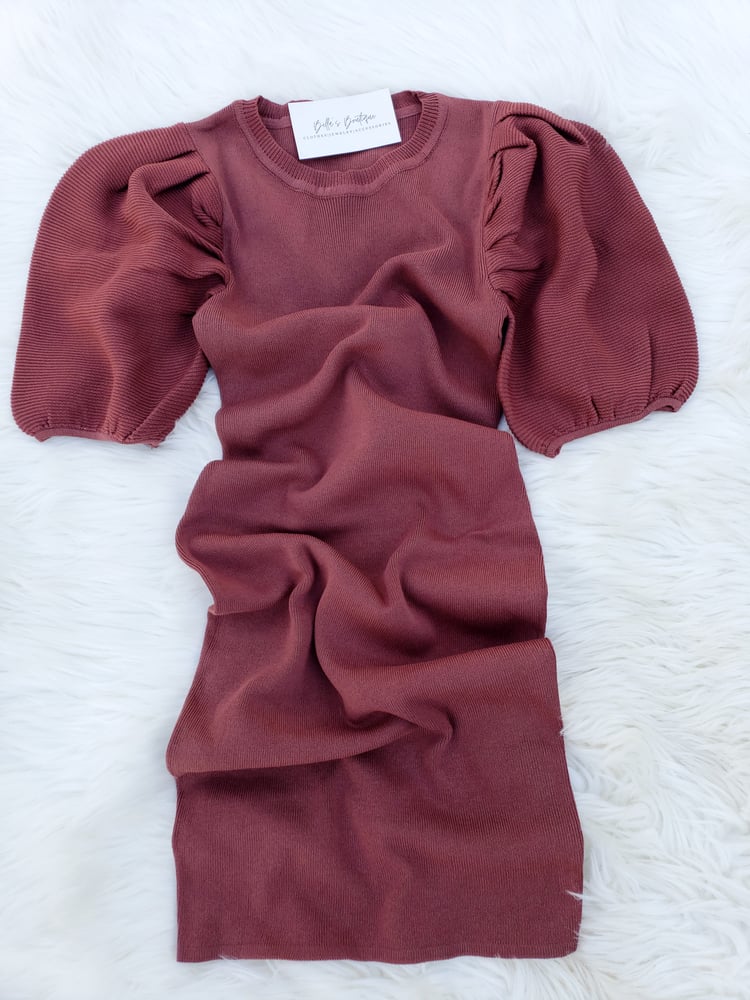 - ribbed knit dress - puff elbow sleeves - bodycon silhouette - mini length - material: 72% viscose, 28% polyester